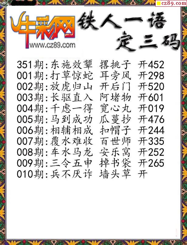 首页 > 福彩3D图谜 > 福彩3D2026010期铁人一句定三码字图谜